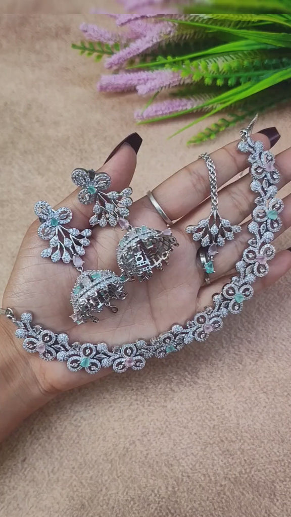 ADRIKA PINK AND MINT GREEN SILVER PLATED AMERICAN DIAMOND NECKLACE SET