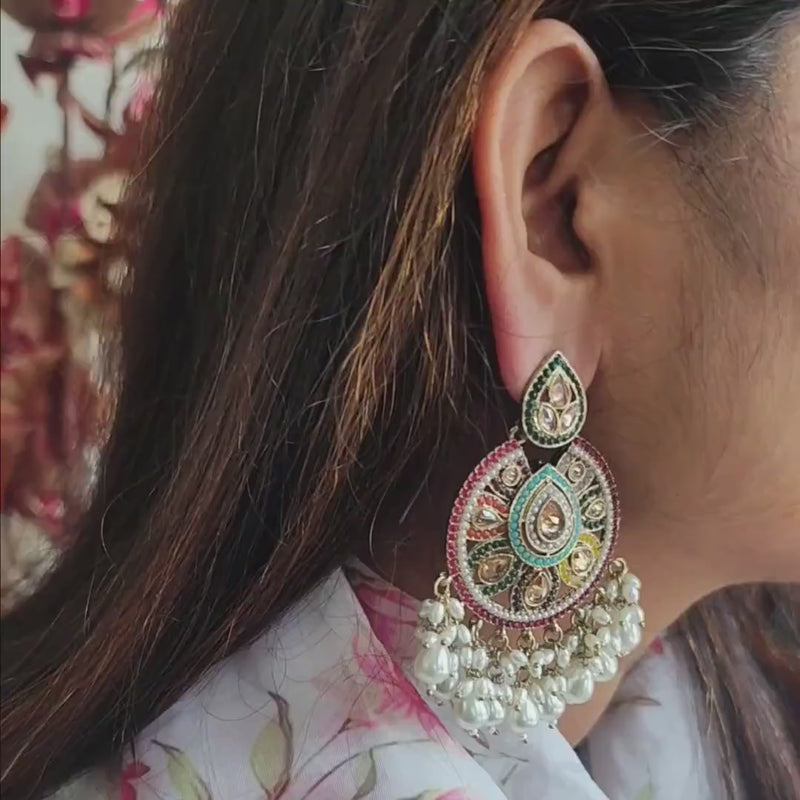Add a touch of elegance and tradition to your look with these exquisite multi-color Chandbali Polki Earrings. Designed to perfection, these chandbali earrings feature intricate detailing with vibrant gemstones and pearls that exude a timeless charm. The circular pattern, accentuated with colourful beads and pearl danglers, adds a statement appeal to any outfit. Perfect for weddings, festive occasions or cultural events, these earrings effortlessly complement traditional and Indo-western attire.